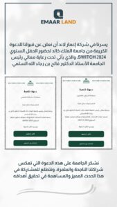 تلقت شركة إعمار لاند للمقاولات العامة والتقنية دعوة رسمية من جامعة الملك خالد لحضور الملتقى السنوي SWITCH 2024، والذي أُقيم تحت رعاية معالي رئيس الجامعة الأستاذ الدكتور فالح بن رجاء الله السلمي.